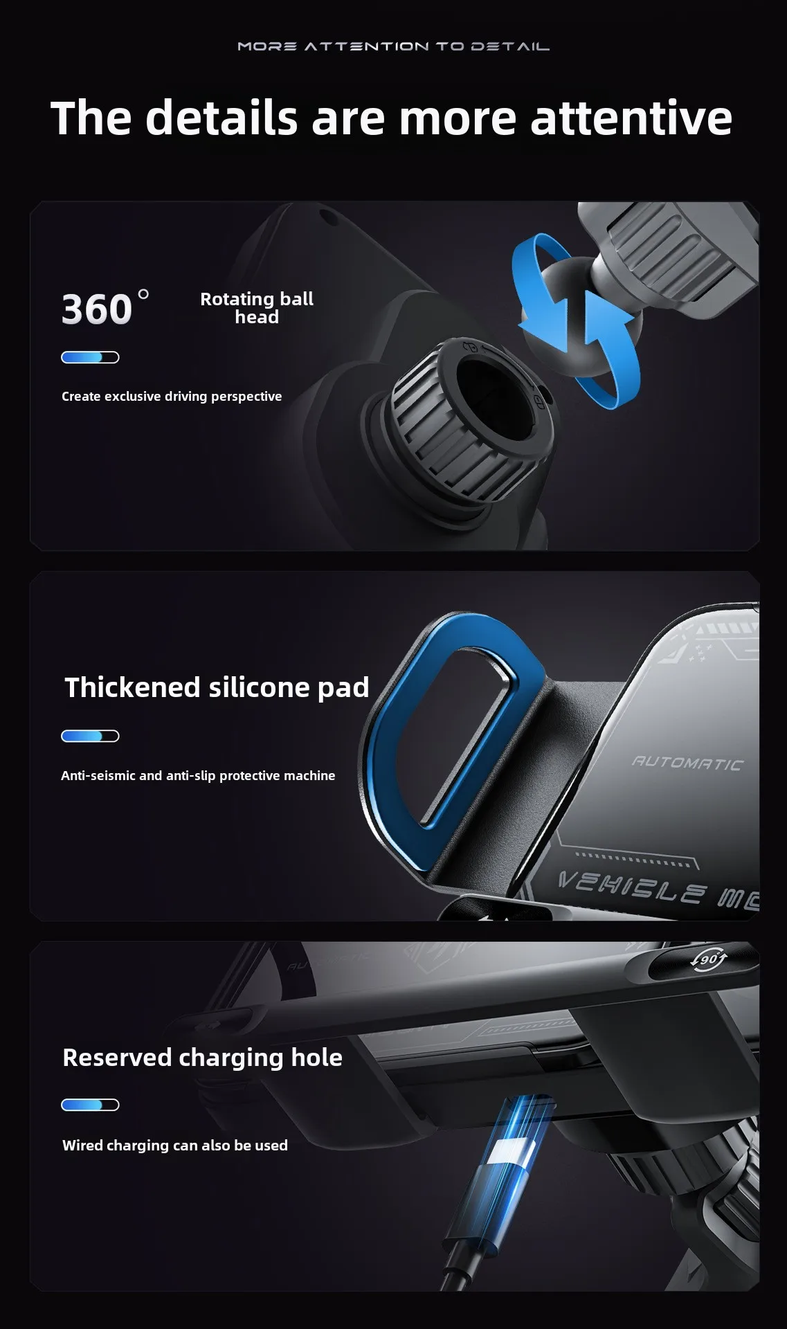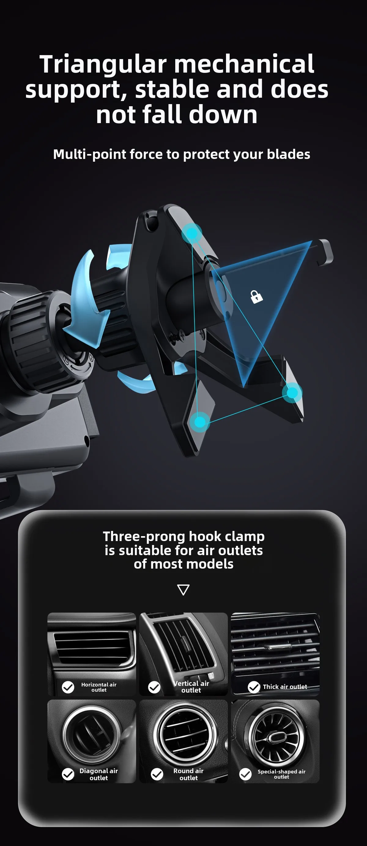 6.Stability & Safety : Padded with soft non-slip and shock absorption silicone, The clips of this phone holder protect the car vents or phones from scratches. Even on the bumping roads, the phone will stay where it is, charging stably. You can operate it with a single hand, 360° rotatable ball can suit all your driving postures for more safety.