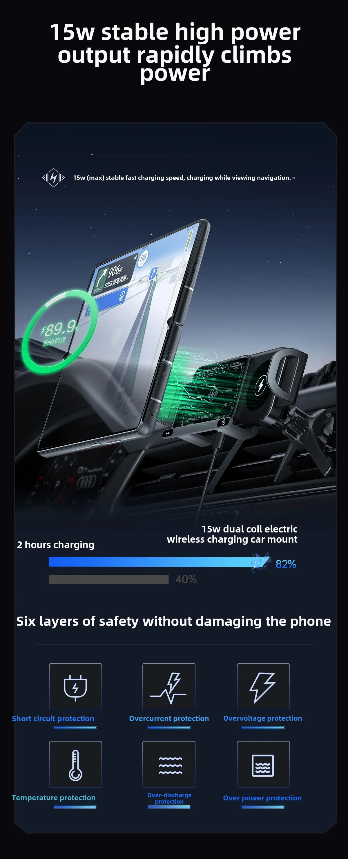 7.15W stable high power outputRapid increase in power consumption.15W stable fast chargingspeed, watching the navigation while charging.the power is still increasing high