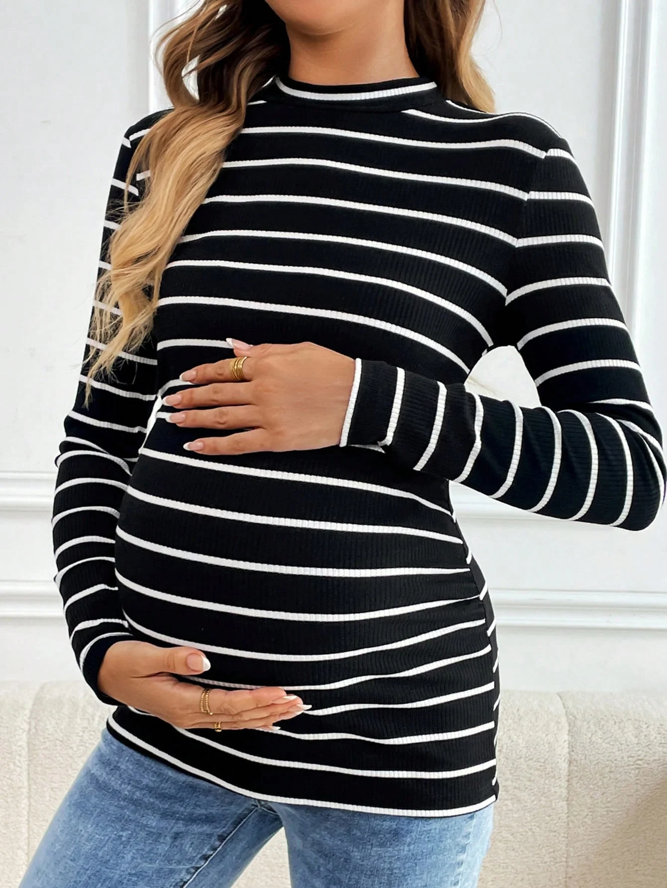 New pure cotton striped round-neck straight-shoulder long-sleeved maternity T-shirt